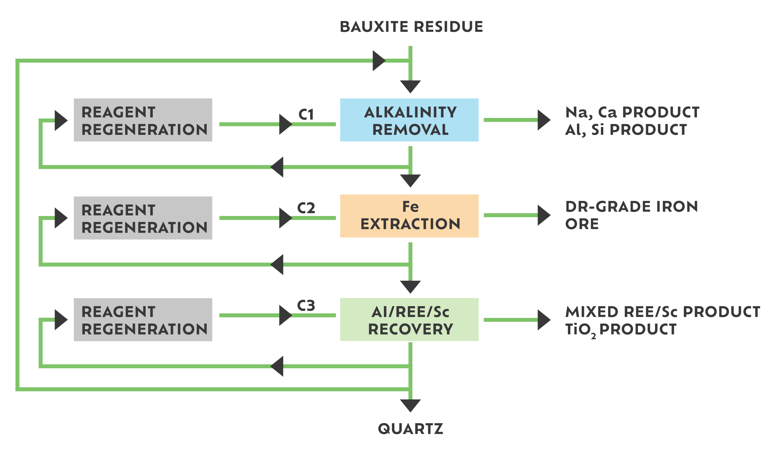 Stored in either vast containment ponds or as dry stacked tailings, this waste is both an environmental burden and an untapped resource rich in iron, rare earth elements (REEs), scandium (Sc), gallium (Ga), and titanium (Ti).