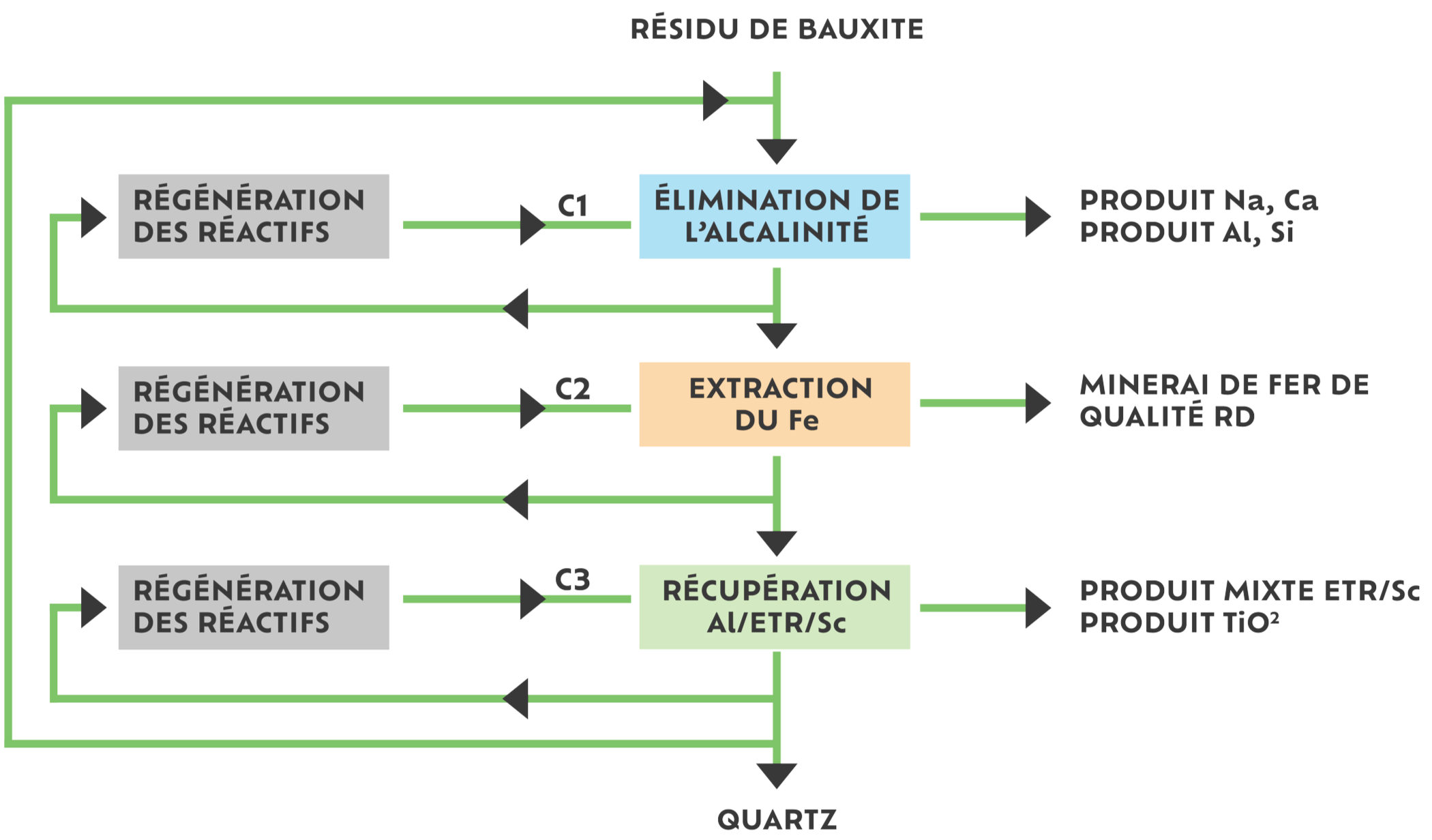 Entreposés dans de vastes bassins de confinement ou en empilements à sec, ces résidus constituent à la fois un fardeau environnemental et une ressource inexploitée, riche en fer, en éléments de terres rares (ETR), en scandium (Sc), en gallium (Ga) et en titane (Ti).